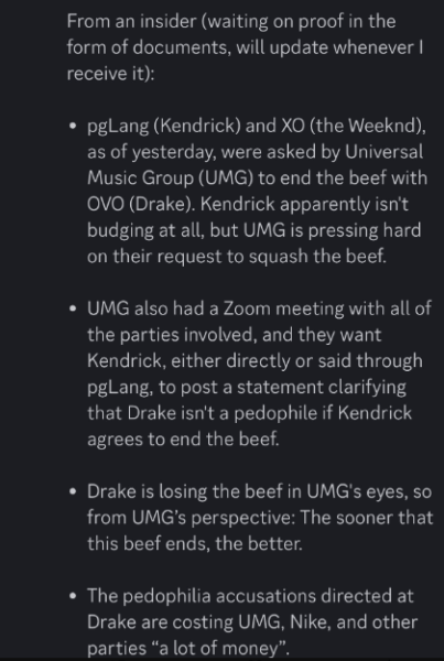 The source’s remarks come shortly after speculations began to circulate that UMG wanted Kendrick Lamar to apologize to Drake for suggesting he was a “pedophile” among other things. A social media post that surfaced as “credible intel” alleged that the record label formally asked Kendrick to end his beef with Drake and post a statement clarifying Drake isn’t a pedophile, as the accusation would cost them money.