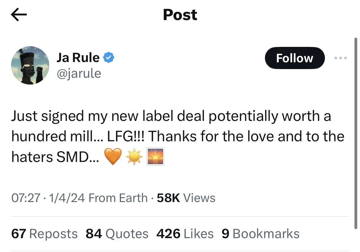 “Just signed my new label deal potentially worth a hundred mill… LFG!!! Thanks for the love and to the haters SMD…”