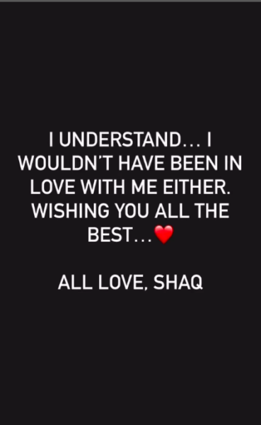 “I UNDERSTAND… I WOULDN’T HAVE BEEN IN LOVE WITH ME EITHER. WISHING YOU ALL THE BEST… ALL LOVE, SHAQ”