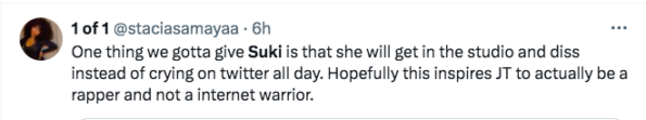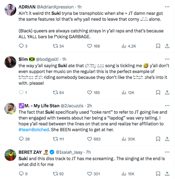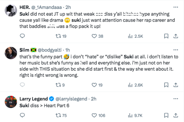 For those confused as to why Suki has decided to set her sights on JT: the two have been going at it lately on X over due to allegations the Miami native shaded Suki first on her newest single “Okay.”