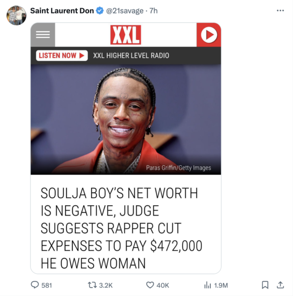 21 Savage made it clear he believes Soulja Boy went too far. He first posted an article that claims Soulja Boy has a negative net worth.