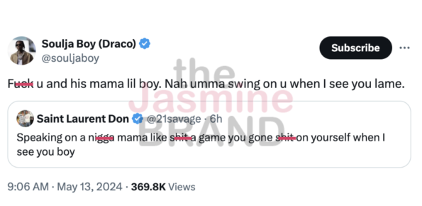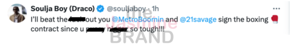 21 Savage has had enough of Soulja Boy. The “Redrum” rapper jumped into the mix after Soulja Boy brought up Metro Boomin’s late mother over a 12-year-old tweet.