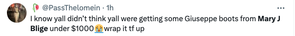Mary J. Blige recently announced that she partnered with fashion house Giuseppe Zanotti to design the stylish footwear, which debuted with a retail price tag of $1,295. Reacting to the news, many social media users expressed their excitement for the collaboration, however, others shared disappointment that the boots were not affordable to everyone. One user wrote:
