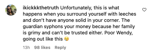 “Unfortunately, this is what happens when you surround yourself with leeches and don’t have anyone solid in your corner. The guardian syphons your money because her family is grimy and can’t be trusted either. Poor Wendy, going out like this.”