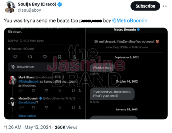 In another upload, Soulja Boy leaked DM’s that Metro Boomin sent him a few months later between September 2012 and January 2013, where the producer was trying to send the rap star beats and connect with him. As a caption to the post, Soulja Boy wrote: