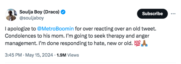 Update: (May 15, 2024): Is Soulja Boy the first rapper to issue an apology on X?