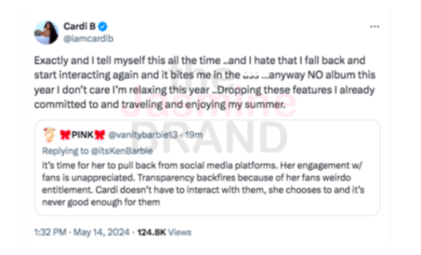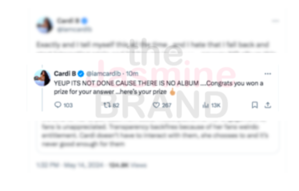 Earlier this week the Grammy Award-winning artist had a heated moment on X while addressing criticism surrounding the yet-to-be-announced release date of her sophomore album. Responding to a fan urging her to take a social media break and ignore the unwarranted hate, Cardi B claimed that due to the negativity, she decided to shelve the highly anticipated project. She wrote,