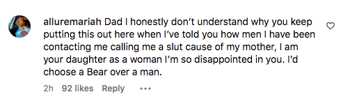 “Dad I honestly don’t understand why you keep putting this out here when I’ve told you how men I have been contacting me calling me a slut cause of my mother, I am your daughter as a woman I’m so disappointed in you. I’d choose a Bear over a man.”