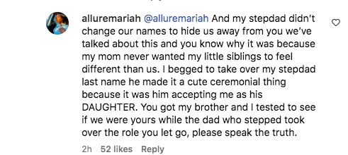 “And my stepdad didn’t change our names to hide us away from you we’ve talked about this and you know why it was because my mom never wanted my little siblings to feel different than us. I begged to take over my stepdad last name he made it a cute ceremonial thing because it was him accepting me as his DAUGHTER. You got my brother and I tested to see if we were yours while the dad who stepped took over the role you let go, please speak the truth.”