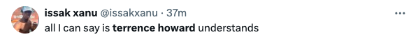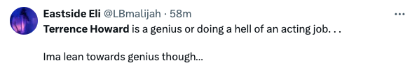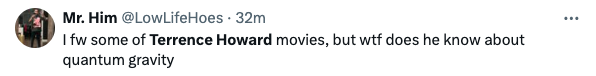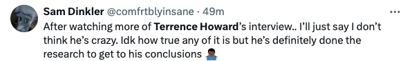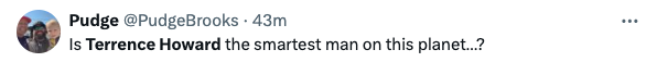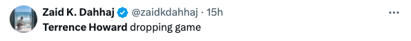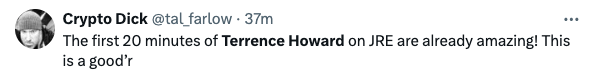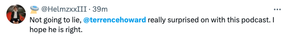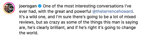 “One of the most interesting conversations I’ve ever had, with the great and powerful @theterrencehoward. It’s a wild one, and I’m sure there’s going to be a lot of mixed reviews, but as crazy as some of the things this man is saying are, he’s clearly brilliant, and if he’s right it’s going to change the world.”
