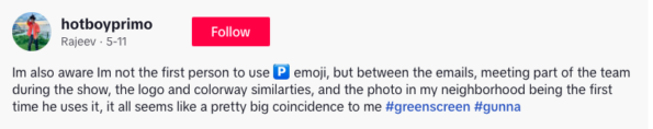 “Im also aware Im not the first person to use [P] emoji, but between the emails, meeting part of the team during the show, the logo and colorway similarties, and the photo in my neighborhood being the first time he uses it, it all seems like a pretty big coincidence to me”