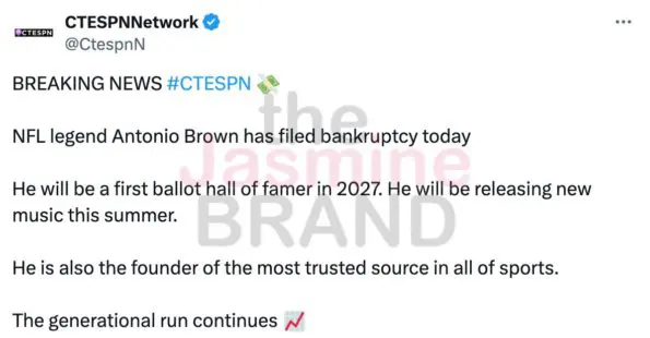 In the post, Antonio Brown also declared himself a “first-ballot Hall of Famer in 2027” while promoting his self-proclaimed “most-trusted source in all of sports,” referencing his own media company, CTESPN, which he founded earlier this year.