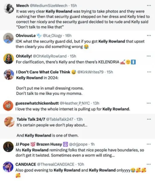 The 43-year-old R&B superstar was seen smiling at the crowd as she gracefully ascended the red carpet steps leading into the theater. However, things took a turn when a woman security guard appeared to rush her away from the cameras. It seems this guard may have also stepped on Kelly Rowland’s dress, potentially sparking the heated exchange that followed. Visibly upset, Kelly Rowland pointed her finger at the woman and appeared to scold her before walking away displeased.