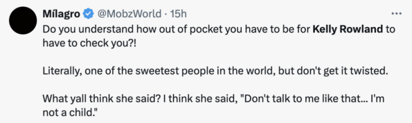 “Do you understand how out of pocket you have to be for Kelly Rowland to have to check you?! Literally, one of the sweetest people in the world, but don’t get it twisted.”