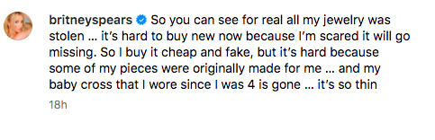 On Sunday (May 26), Britney Spears shared with her 42.2 million Instagram followers that her jewelry was stolen. In a video opening the drawers of an almost empty jewelry case, she said,