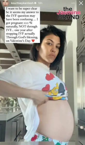 Clarifying misconceptions about her last pregnancy, Kourtney Kardashian Barker later explained that she conceived her son, Rocky Thirteen, naturally, one year after discontinuing IVF treatments. She wrote on top of her showing off her then baby bump,