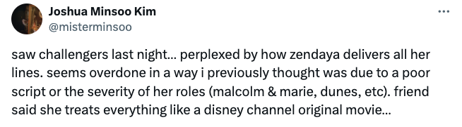 “saw challengers last night… perplexed by how zendaya delivers all her lines. seems overdone in a way i previously thought was due to a poor script or the severity of her roles (malcolm & marie, dunes, etc). friend said she treats everything like a disney channel original movie…”
