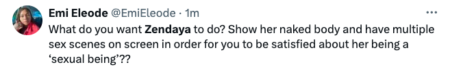 “What do you want Zendaya to do? Show her naked body and have multiple sex scenes on screen in order for you to be satisfied about her being a ‘sexual being’??”