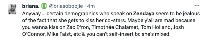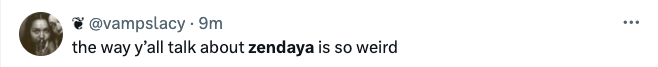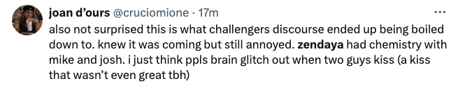 “Zendaya is sexy but not a sexual being. I can’t think of a single piece of media where she had chemistry with another person. The boys were shouldering the burden in Challengers, and luckily her character could withstand her asexuality. It’s totally disney-related”