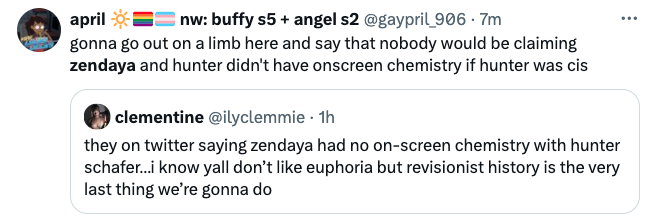 The remarks slowly began gaining traction as social media users chimed in with their own polarizing thoughts. Some agreed with criticism of Zenday’s acting ability and chemistry with her fictional love interests, also bringing up the on-screen relationship between Zendaya and her Euphoria co-star Hunter Schafer. However, others fiercely defended the celebrity, instead questioning critics’ expectations of what intimacy for entertainment should look like. One user wrote: