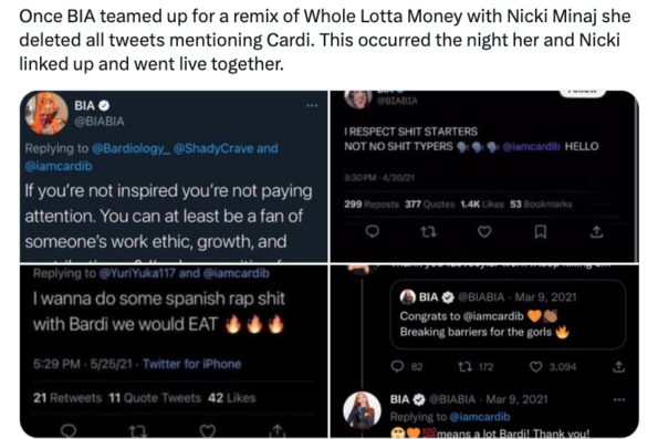 It’s also been speculated that BIA first began taking issue with Cardi around the time she landed a feature with the self-proclaimed queen of rap Nicki Minaj for the “Whole Lotta Money” remix. As you may know, Cardi and Nicki Minaj have famously been at odds with one another pretty much ever since Cardi came onto the scene.