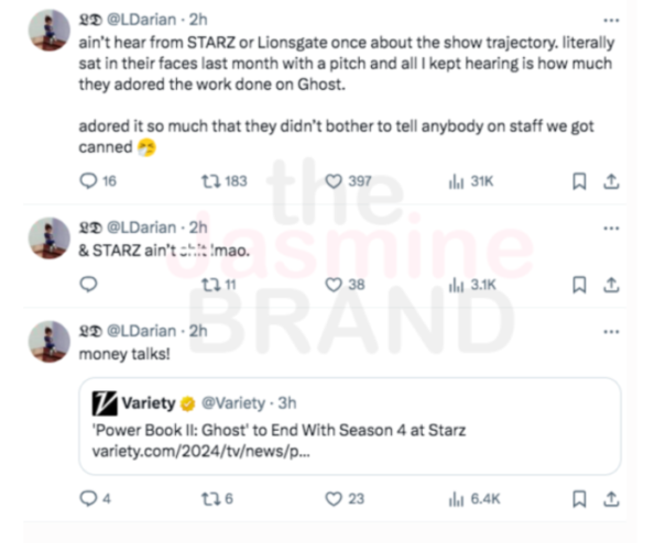 In a follow-up post backing allegations from one of the show’s writers that Starz “didn’t bother to tell anybody on staff” about the cancelation, Michael Rainey Jr. added,
