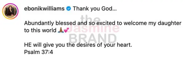 “Thank you God… Abundantly blessed and so excited to welcome my daughter to this world. HE will give you the desires of your heart. Psalm 37:4.”