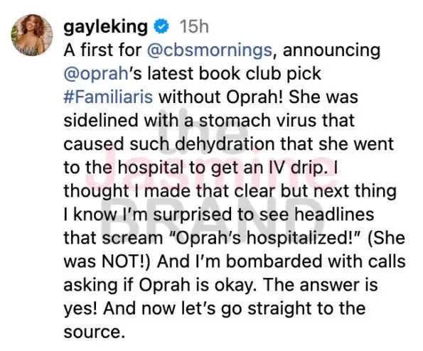 “She was sidelined with a stomach virus that caused such dehydration that she went to the hospital to get an IV drip. I thought I made that clear but next thing I know I’m surprised to see headlines that scream “Oprah’s hospitalized!” (She was NOT!)”