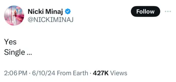 Original Story (June 10, 2024): Nicki Minaj’s latest subliminal tweet has left her fans in a frenzy.