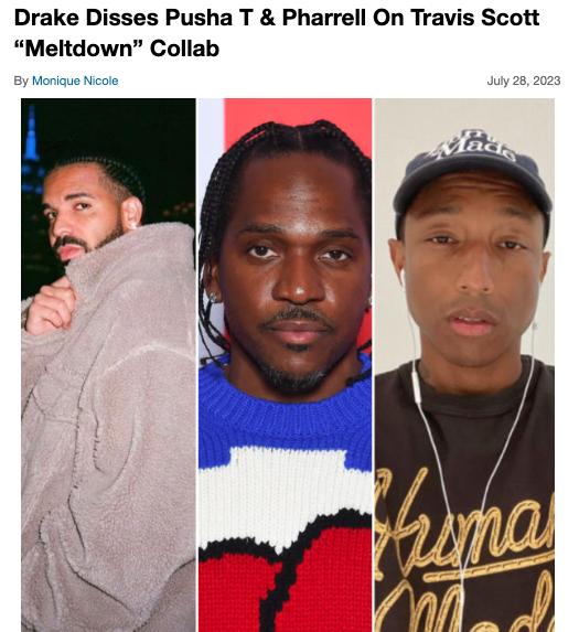 Pharrell and Drake’s issues go back further than this year, however. As you may know, the two have been at odds since Pharell’s close friend Pusha T engaged in a rap feud with Drake back in 2018. Seemingly feeling slighted by the “Happy” singer choosing a side, Drake took aim at Pharrell several times since, most famously rapping on Travis Scott’s 2023 song “Meltdown”: