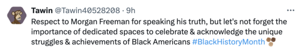 “Respect to Morgan Freeman for speaking his truth, but let’s not forget the importance of dedicated spaces to celebrate & acknowledge the unique struggles & achievements of Black Americans.”