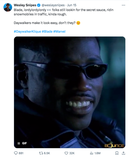 While appearing to poke fun at Marvel’s struggle to get the film off the ground, Wesley Snipes uploaded a GIF of himself as the beloved character Eric Brooks/Blade and captioned the post,