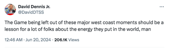 “The Game being left out of these major west coast moments should be a lesson for a lot of folks about the energy they put in the world, man”