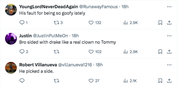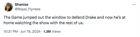 “The Game jumped out the window to defend Drake and now he’s at home watching the show with the rest of us.”