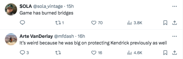 Still, many fans speculated that he took Drake’s side in their viral feud, posting Drake’s 2015 single “Energy” while Drake and Lamar were going at it hit for hit. He also released his own diss track against Rick Ross, who was also feuding with Drake.