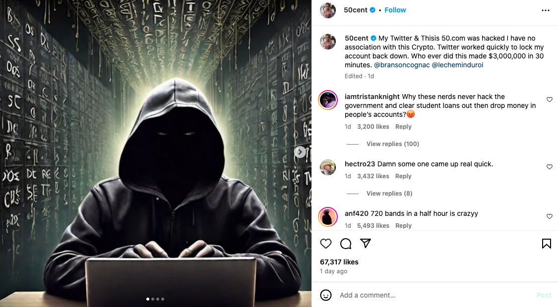 The G-Unit founder claimed that his social media account was accessed without his knowledge recently, alleging that hackers made off with $3 million from a cryptocurrency scam they executed using his name.