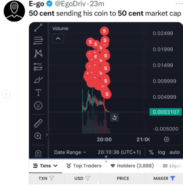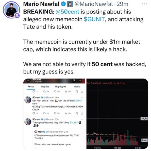 “BREAKING: @50cent is posting about his alleged new memecoin $GUNIT, and attacking Tate and his token. The memecoin is currently under $1m market cap, which indicates this is likely a hack. We are not able to verify if 50 cent was hacked, but my guess is yes.”