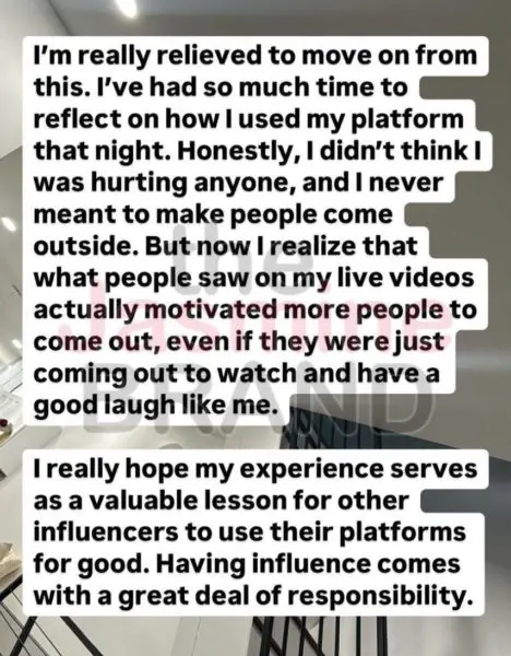 “I’m really relieved to move on from this. I’ve had so much time to reflect on how I used my platform that night. Honestly, I didn’t think I was hurting anyone, and I never meant to make people come outside. But now I realize that what people saw on my live videos actually motivated more people to come out, even if they were just coming out to watch and have a good laugh like me. I really hope my experience serves as a valuable lesson for other influencers to use their platforms for good. Having influence comes with a great deal of responsibility.”