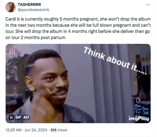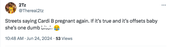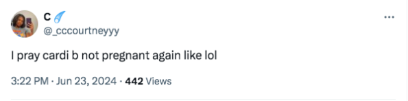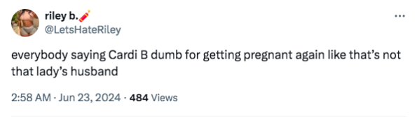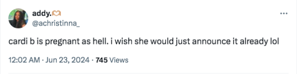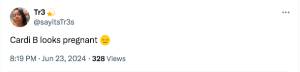 Over the weekend fans of the “Enough” artist flocked to X and IG to react to growing rumors that their fav is pregnant with her third child. Speculations that Cardi B, 31, and her husband Offset, 32, are set to welcome a new addition to their family seemingly reached new heights thanks to Cardi B’s recent appearance at the 2024 Hollywood Unlocked Impact Awards. Fans couldn’t help but notice that the rapper appeared to be more covered at the event, switching up her signature risqué look to show less skin. While accepting the Inspiration Award, she seemingly touched on her marriage and Offset’s previous infidelities, sharing,
