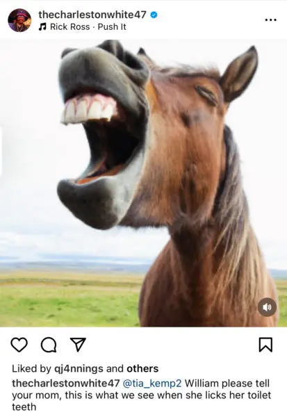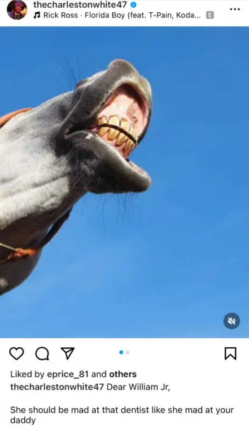 While stating that he won’t involve Ross nor his son William Roberts III in the matter, White wrapped his posts by seemingly imitating Kemp with photo uploads of horse teeth. In one post he wrote,