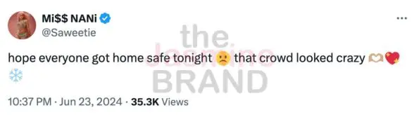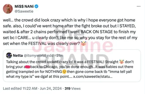 “The crowd did look crazy, which is why I hope everyone got home safe. Also, I could’ve went home after the fight broke out, but I stayed and waited. After 2 Chainz performed, I went back on stage to finish my set, because I care… you clearly don’t like me, so why you stay for the rest of my set when the festival was clearly over?”