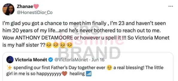 “I’m glad you got a chance to meet him finally, I’m 23 and haven’t seen him 20 years of my life… and he’s never bothered to reach out to me. Wow ANTHONY DETAMOORE or however u spell it! So Victoria Monet is my half sister?”