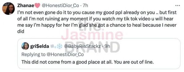 “I’m not even gone do it to you cause my good pol already on you .. but first of all I’m not ruining any moment if you watch my TikTok video u will hear me say I’m happy for her I’m glad she got a chance to heal because I never did.”