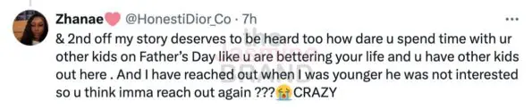 “& 2nd off my story deserves to be heard too how dare u spend time with ur other kids on Father’s Day like u are bettering your life and u have other kids out here. And I have reached out when I was younger he was not interested so u think imma reach out again???”