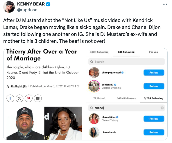 In what many surmise to be a revenge-motivated move, social media users confirmed that Drake has since followed DJ Mustard’s ex Chanel Thierry on Instagram. If you recall, Mustard and Thierry famously split following a year of marriage back in 2022, despite their 3 children and 11 years of dating.