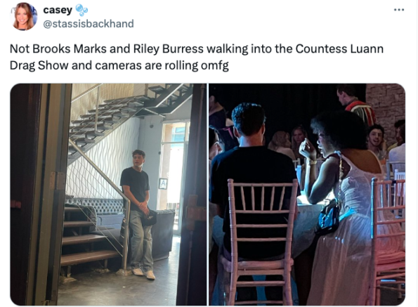 “Not Brooks Marks and Riley Burress walking into the Countess Luann Drag Show and cameras are rolling omfg”