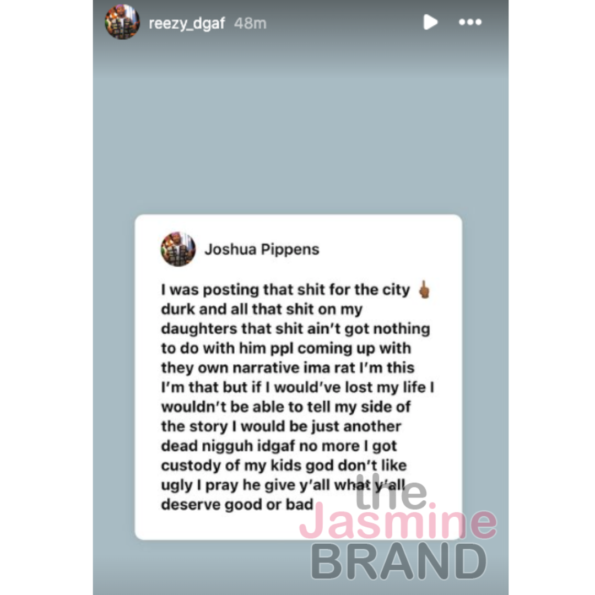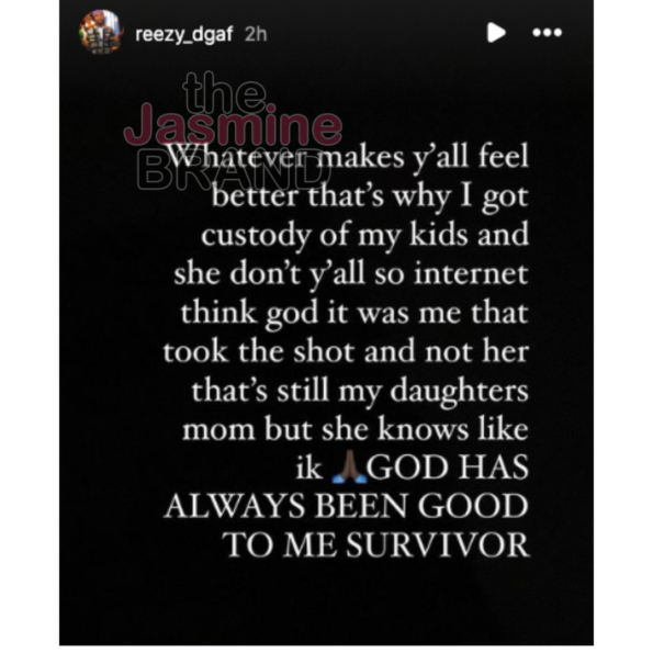 “Whatever makes y’all feel better that’s why I got custody of my kids and she don’t y’all so internet think god it was me that took the shot and not her that’s still my daughters mom but she knows like ik [prayer emoji]. GOD HAS ALWAYS BEEN GOOD TO ME SURVIVOR.”