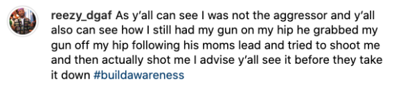 “As y’all can see I was not the aggressor and y’all also can see how I still had my gun on my hip he grabbed my gun off my hip following his moms lead and tried to shoot me and then actually shot me I advise y’all see it before they take it down”
