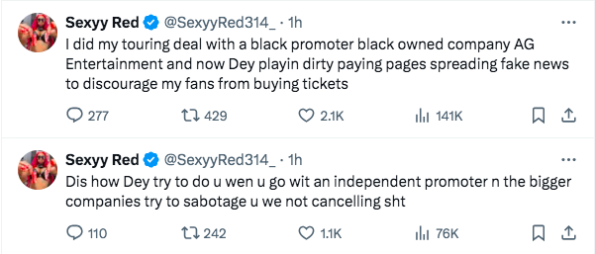 “I did my touring deal with a black promoter black owned company AG Entertainment and now Dey playin dirty paying pages spreading fake news to discourage my fans from buying tickets”