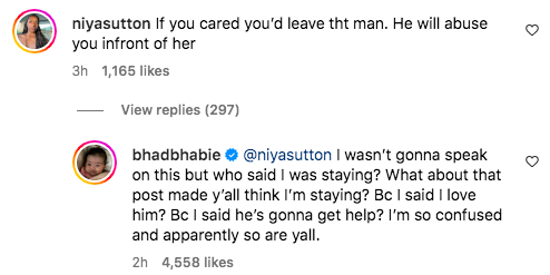 “I wasn’t gonna speak on this but who said I was staying? What about that post made y’all think I’m staying? Bc I said I love him? Bc I said he’s gonna get help? I’m so confused and apparently so are yall.”